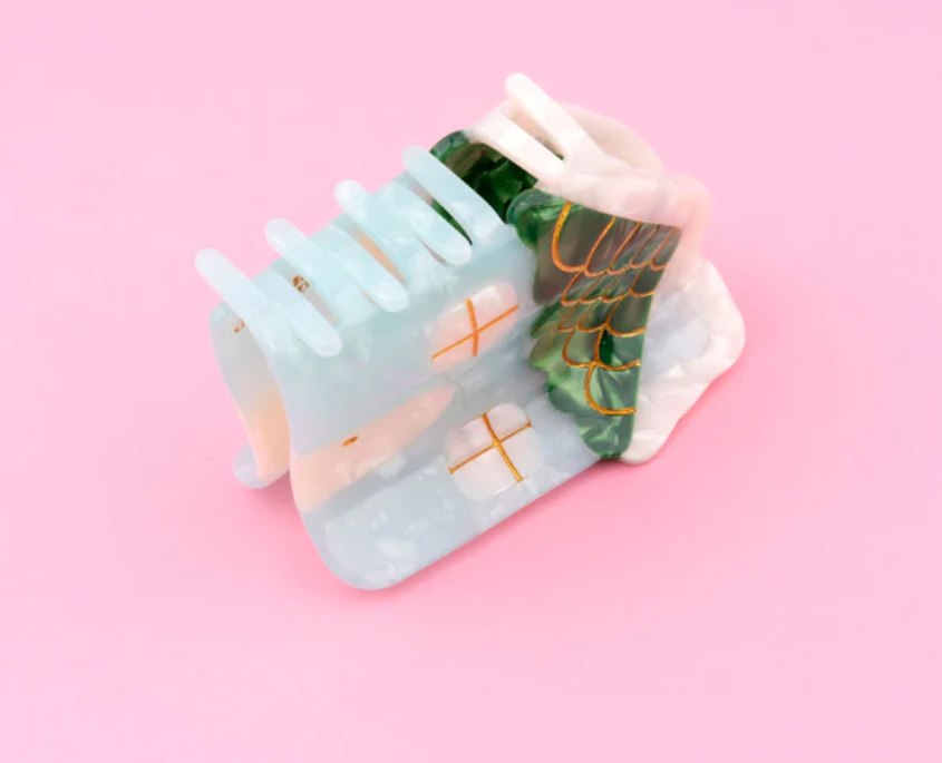 A pretty house straight from a fairytale! This creative hair claw stands out with its beautiful pearly white, pastel blue and deep green colors. We especially love the gold details and the snow on the roof reminding us of the illustrations from our childhood storybooks.