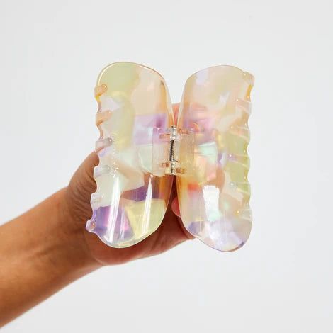 Color: iridescent multicolor (gold, pink, purple, pearl), silver tone hardware