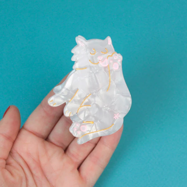 This hair claw is made from white cellulose acetate, and the pink and gold details are hand-painted.