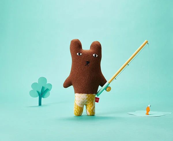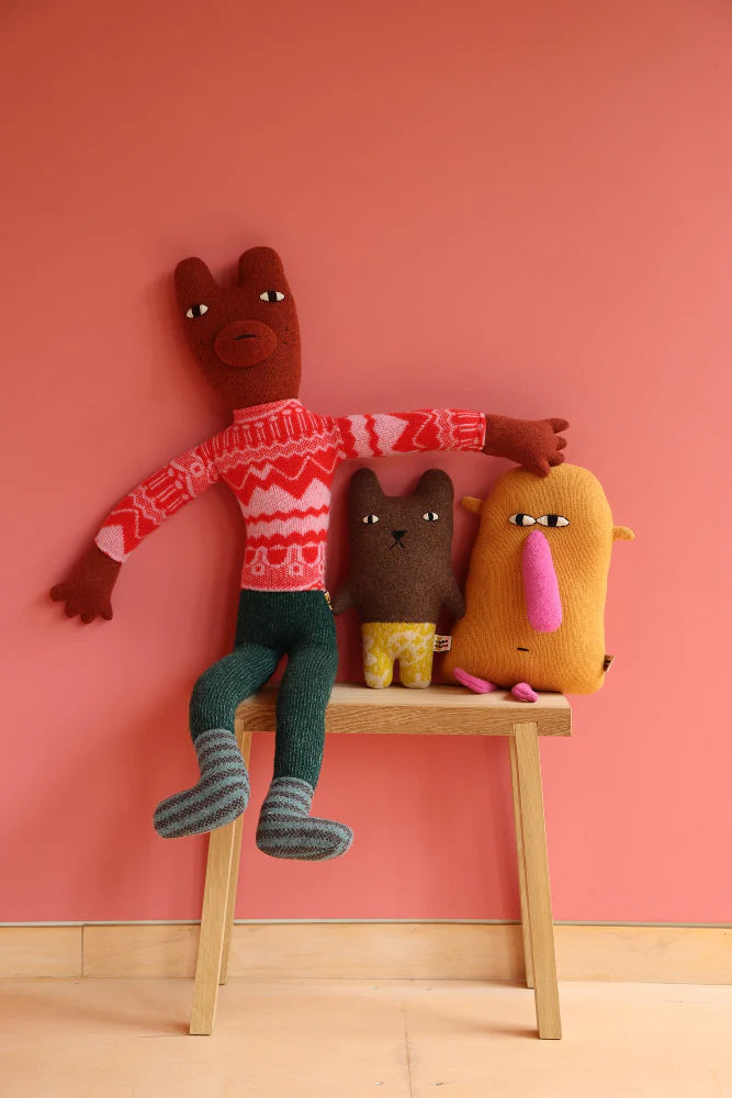 Barry is knitted from 100% lambswool. We knit all our lambswoolcreatures at our Knit Shop in Dundee using the softest yarns. Eachone is then assembled and embroidered by hand - you can find thename of each creature's maker on its cardboard tag. We package eachone in a drawstring cotton bag and give each creature a little squeezebefore sending it to its new home.