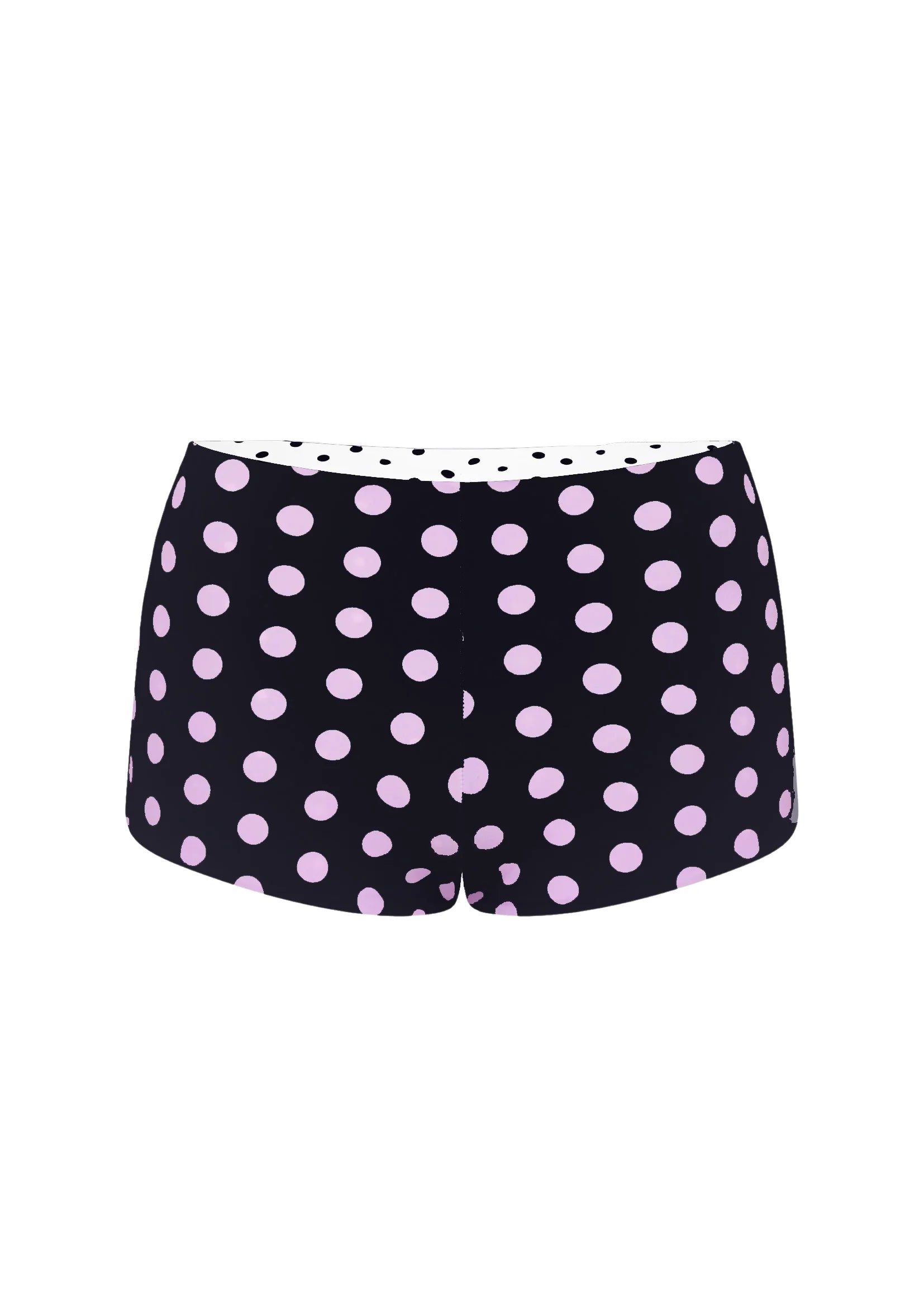 REVERSIBLE SWIM BOOTY SHORTS IN POLKA DOT PRINT WITH BLACK BINDING