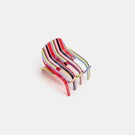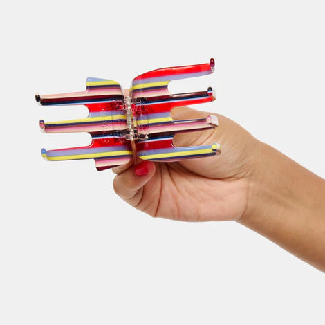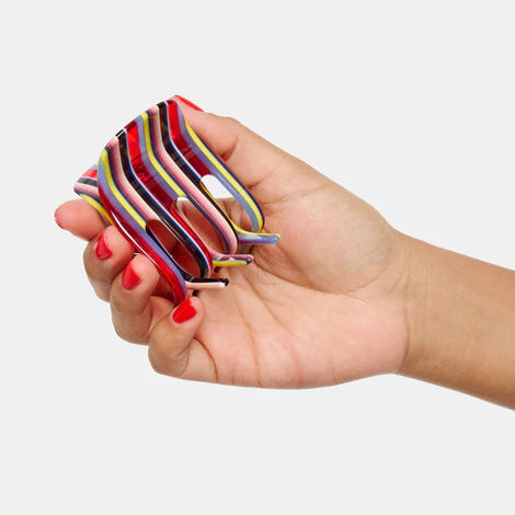 Color: multicolor stripe, red, yellow, blue, black, silver tone hardware