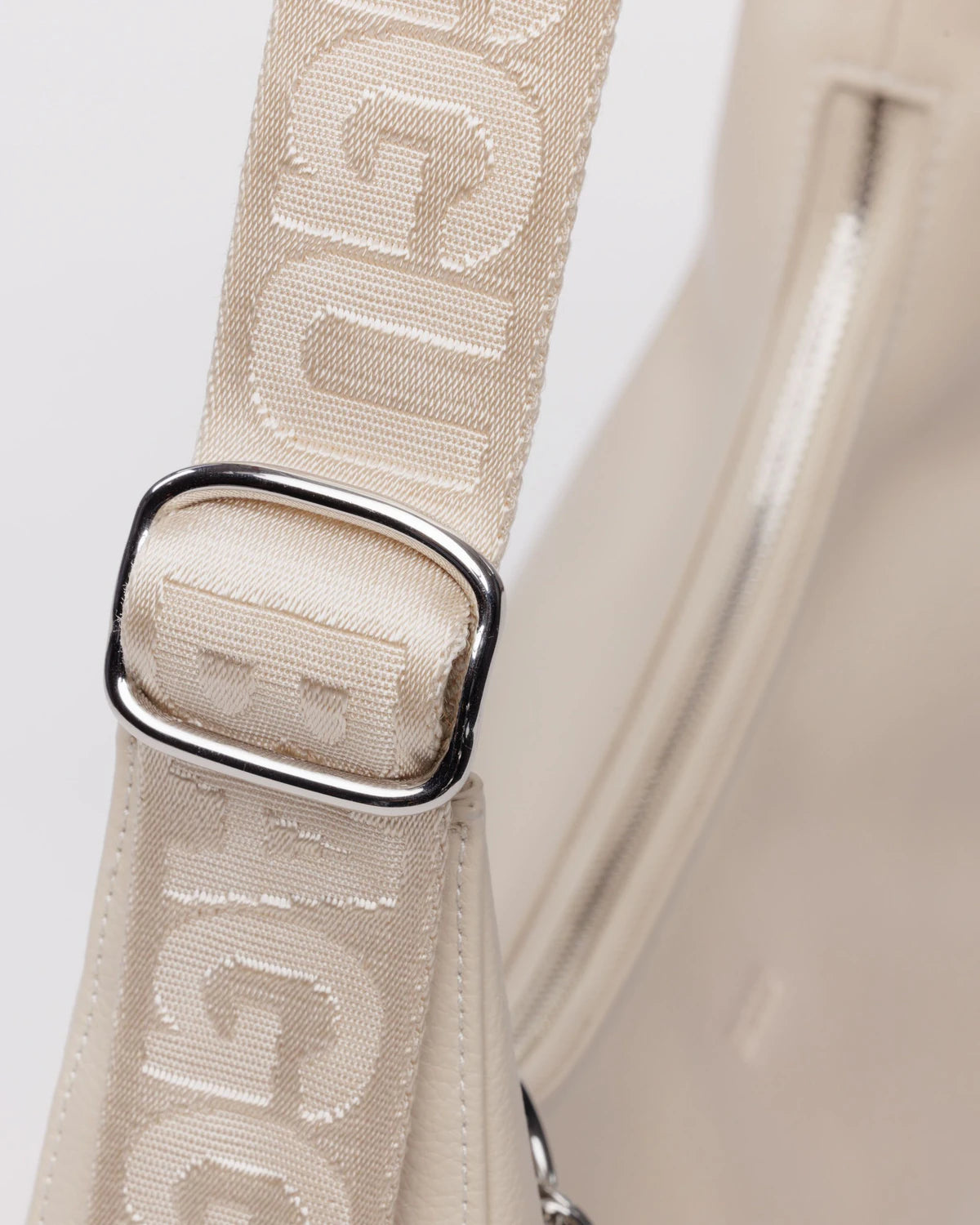 Our medium crescent shape in recycled leather. Elevated, durable, and roomy. With an interior zip pocket and thoughtful additions like a key leash and debossed keychain.